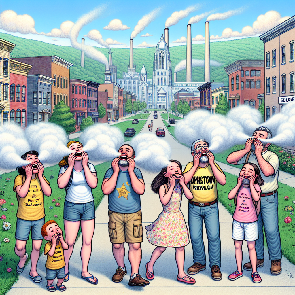 ChatGPT: Generate an image that portrays a lighthearted scene from Johnstown, Pennsylvania, where the air is noticeably clear and fresh. Show people happily taking deep breaths of the clean air, visibly relieved and relaxed. In the background, capture a smaller number of individuals receiving their Master's degrees in Education, with a shift in focus from aerosol knowledge to the simple joy of breathing in the pollution-free air. The image should have a humorous and wholesome vibe, suitable for sharing on Reddit.
