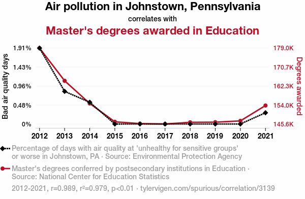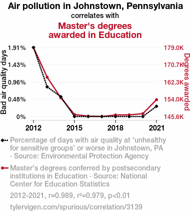 This means 97.9% of the change in the one variable (i.e., Master's degrees awarded in Education) is predictable based on the change in the other (i.e., Air pollution in Johnstown, Pennsylvania) over the 10 years from 2012 through 2021.