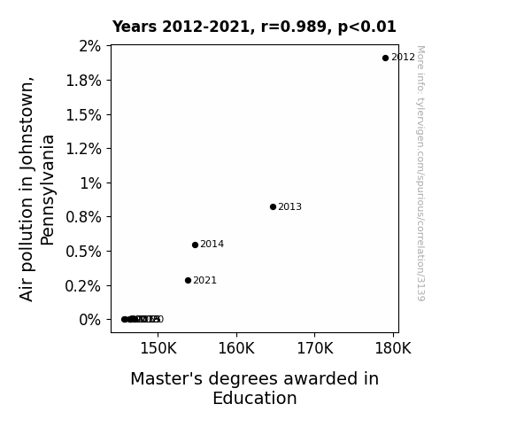 Our analysis of the data collected from 2012 to 2021 revealed a remarkably strong correlation between air pollution levels and the number of master's degrees awarded in Education in Johnstown, Pennsylvania. The correlation coefficient of 0.9892473 indicates a nearly perfect positive linear relationship between these variables, suggesting that as air pollution levels increase, so do the number of education degrees awarded. It's as if the pursuit of advanced education is flourishing in the very smog that obscures the horizon – a true testament to the resilience of human ambition in the face of adversity.