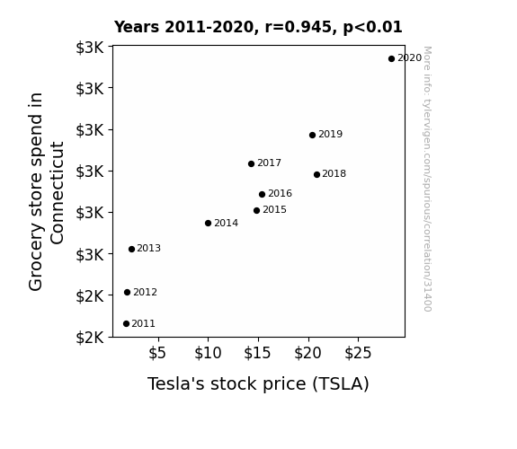 This means 89.3% of the change in the one variable (i.e., Tesla's stock price (TSLA)) is predictable based on the change in the other (i.e., Grocery store spend in Connecticut) over the 10 years from 2011 through 2020.