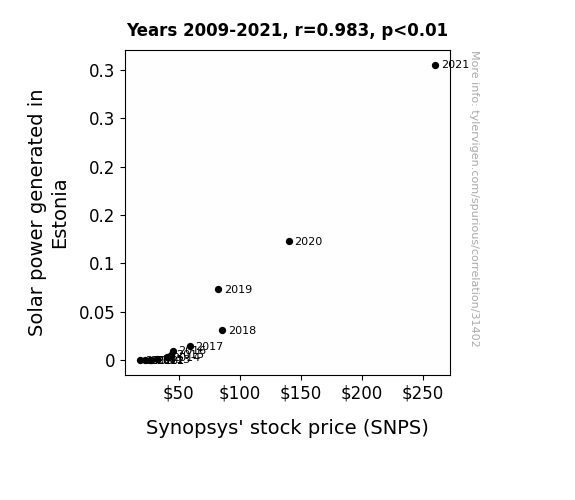 This means 96.6% of the change in the one variable (i.e., Synopsys' stock price (SNPS)) is predictable based on the change in the other (i.e., Solar power generated in Estonia) over the 13 years from 2009 through 2021.