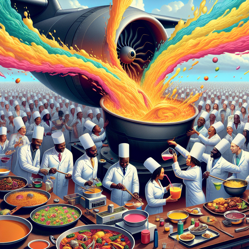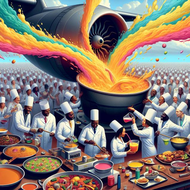 User prompt: Please respond with an image generation prompt that would be likely to create an interesting visual using DALLE-3, using the following style: [ A Discovery magazine cover image ] and depicting this scene: In a bustling Grenadian kitchen, a group of engineers, proudly wearing their Master's gowns, are gathered around a massive jet engine. They are pouring various colorful liquids into a mixing bowl, creating a vibrant and aromatic jet fuel recipe. In the background, chefs are using the jet fuel as a condiment, drizzling it over local dishes, such as callaloo and fried plantains. The aroma of the innovative jet fuel condiment fills the air, symbolizing Grenada's embrace of this unusual and exciting culinary addition, thanks to the engineering expertise of the Master's graduates. Keep the visual depiction simple. Do not include any words or speech bubbles.