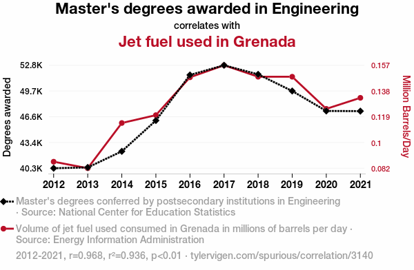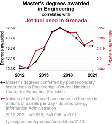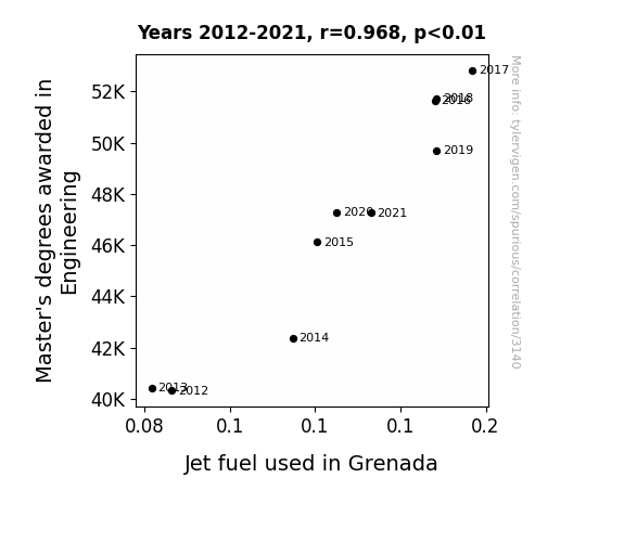 This means 93.6% of the change in the one variable (i.e., Jet fuel used in Grenada) is predictable based on the change in the other (i.e., Master's degrees awarded in Engineering) over the 10 years from 2012 through 2021.