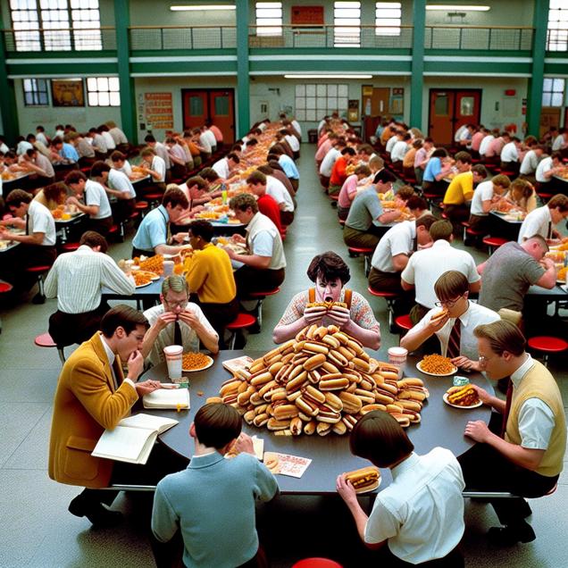 ChatGPT: An image that looks like it is a scene from A Disney Movie, depicting a bustling high school cafeteria filled with 12th graders focused on studying for exams, while at the center, the reigning Nathan's Hot Dog Eating Competition Champion sits amidst a growing tower of hotdogs. The students are all engaged in their studies, with books and notebooks spread out on the tables, while the champion displays a determined focus as they consume hotdogs with impressive speed. The energy in the room is palpable, depicting both academic dedication and competitive eating prowess in a spirited and vibrant atmosphere.
