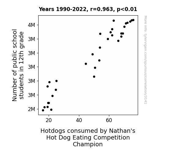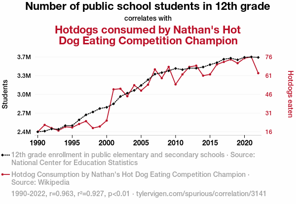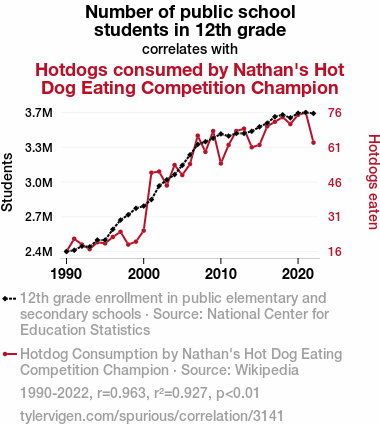 - The spurious research paper: The Grade Wiener: A Correlation Between 12th Grade Enrollment and Champion Hotdog Consumption at Nathan's Hot Dog Eating Competition