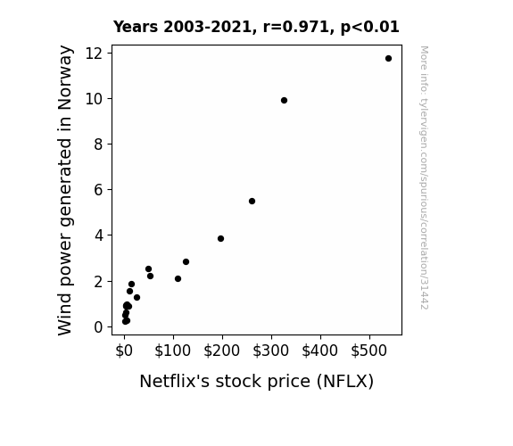 This means 94.2% of the change in the one variable (i.e., Netflix's stock price (NFLX)) is predictable based on the change in the other (i.e., Wind power generated in Norway) over the 19 years from 2003 through 2021.