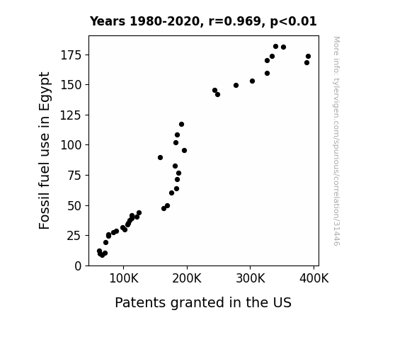 This means 93.9% of the change in the one variable (i.e., Patents granted in the US) is predictable based on the change in the other (i.e., Fossil fuel use in Egypt) over the 41 years from 1980 through 2020.