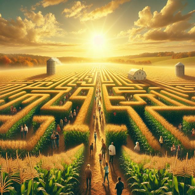 Prompt: [ A photo-realistic image ] A bucolic scene is depicted, featuring a vast Indiana cornfield bathed in warm sunlight. The sprawling field is filled with rows of vibrant GMO corn, reaching out toward the distant horizon. At the center of the field, a lively corn maze comprised of twisting paths and towering stalks beckons visitors to explore its intricacies. Inside the maze, a group of judges is diligently observing and scoring participants as they maneuver through the challenge. The image captures the fusion of rural beauty and agricultural innovation, with the proliferation of GMO corn leading to the surge of judges overseeing these popular mazes at local fall festivals. The depiction should include only scenes, people, and objects, it should not include text or speech bubbles.
