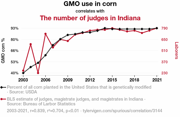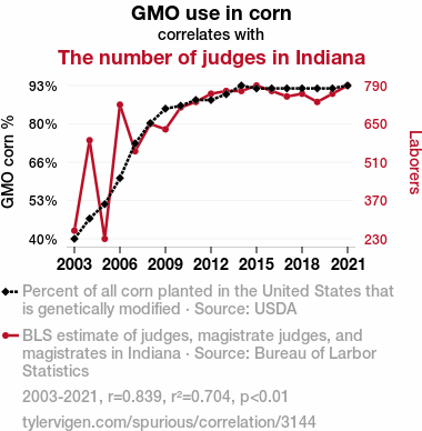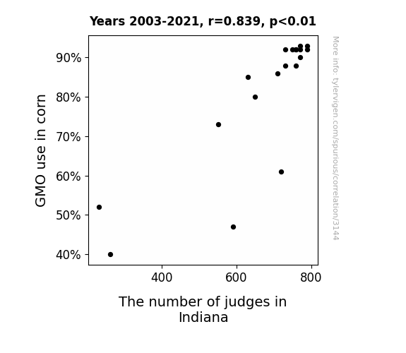 - The spurious research paper: Stalk-ing the Connection: Corn GMO Usage and the Judicial Headcount in Indiana