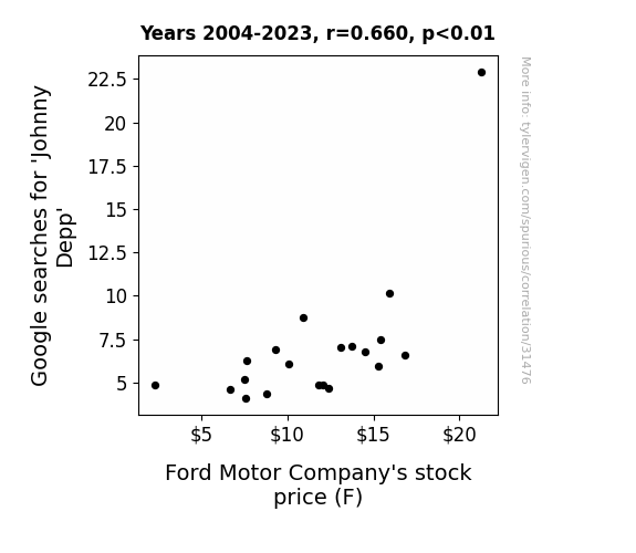 This means 43.6% of the change in the one variable (i.e., Ford Motor Company's stock price (F)) is predictable based on the change in the other (i.e., Google searches for 'Johnny Depp') over the 20 years from 2004 through 2023.