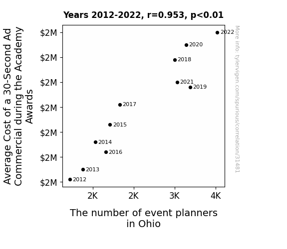 This means 90.8% of the change in the one variable (i.e., The number of event planners in Ohio) is predictable based on the change in the other (i.e., Average Cost of a 30-Second Ad Commercial during the Academy Awards) over the 11 years from 2012 through 2022.