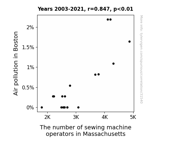 This means 71.8% of the change in the one variable (i.e., The number of sewing machine operators in Massachusetts) is predictable based on the change in the other (i.e., Air pollution in Boston) over the 19 years from 2003 through 2021.