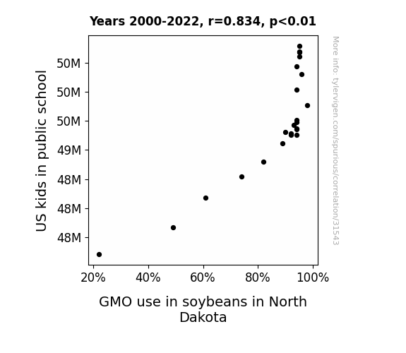 This means 69.6% of the change in the one variable (i.e., GMO use in soybeans in North Dakota) is predictable based on the change in the other (i.e., US kids in public school) over the 23 years from 2000 through 2022.