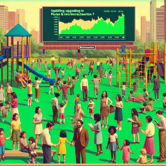 Prompt: Prompt: Generate an image inspired by a TIME magazine cover, portraying a vibrant green park with a group of enthusiastic young adults, all proudly displaying their Master's degrees in Parks & Recreation. They are gathered around an innovative jungle gym, deep in discussion about enhancing the play area. In the background, a digital display shows the steadily rising stock price of Johnson & Johnson (JNJ). Children play joyfully nearby, occasionally seeking assistance from their parents for minor scrapes and bruises, creating a wholesome and lively atmosphere. The depiction should include only scenes, people, and objects, it should not include text or speech bubbles.