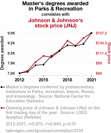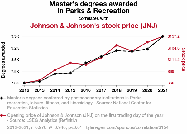 Park and Recreation Studies, Master's degree, Johnson & Johnson, JNJ stock price, correlation coefficient, stock market performance, National Center for Education Statistics, LSEG Analytics, Refinitiv, market influencers, unexpected correlations.