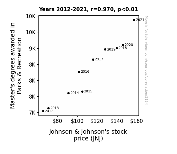 This means 94% of the change in the one variable (i.e., Johnson & Johnson's stock price (JNJ)) is predictable based on the change in the other (i.e., Master's degrees awarded in Parks & Recreation) over the 10 years from 2012 through 2021.