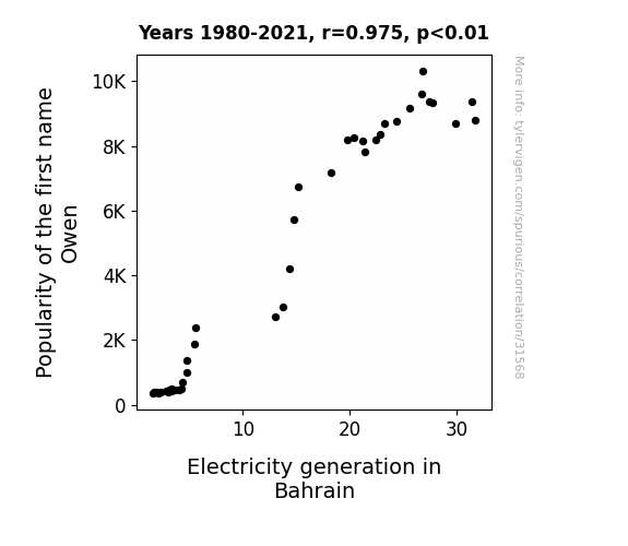 This means 95.2% of the change in the one variable (i.e., Electricity generation in Bahrain) is predictable based on the change in the other (i.e., Popularity of the first name Owen) over the 42 years from 1980 through 2021.