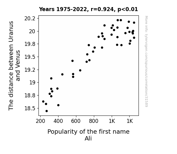 This means 85.4% of the change in the one variable (i.e., Popularity of the first name Ali) is predictable based on the change in the other (i.e., The distance between Uranus and Venus) over the 48 years from 1975 through 2022.