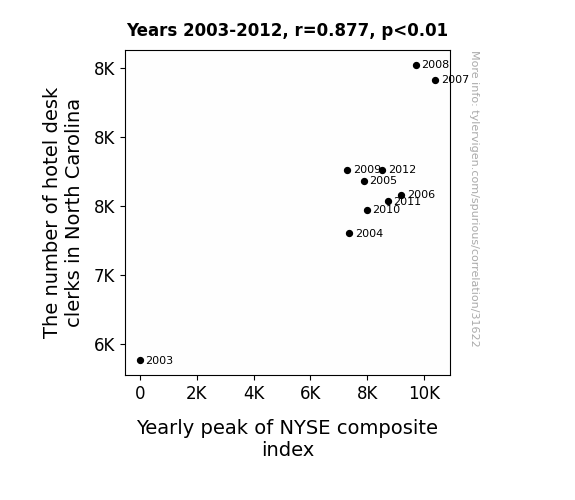 This means 76.9% of the change in the one variable (i.e., Yearly peak of NYSE composite index) is predictable based on the change in the other (i.e., The number of hotel desk clerks in North Carolina) over the 10 years from 2003 through 2012.