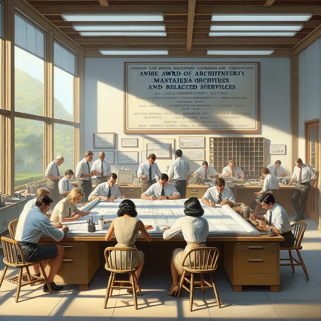 Prompt: Generating prompt... Prompt: Create an image of a small office setting in the Virgin Islands, where a group of secretaries are gathered around a large drafting table, discussing project schedules and flipping through blueprints. The office is adorned with a sign that proudly proclaims "Master's Degrees in Architecture and Related Services Awarded Here." As the master's degrees in architecture decline, the office becomes quieter and the secretaries find themselves with fewer blueprints to draft and schedules to architect. This prompt aims to create an engaging visual representation of the described scene using the style of a Discovery magazine cover image. The depiction should include only scenes, people, and objects, it should not include text or speech bubbles.