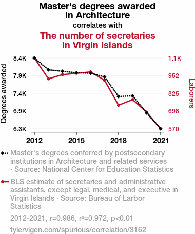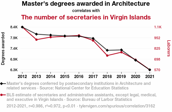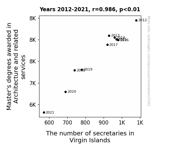 This means 97.2% of the change in the one variable (i.e., The number of secretaries in Virgin Islands) is predictable based on the change in the other (i.e., Master's degrees awarded in Architecture) over the 10 years from 2012 through 2021.
