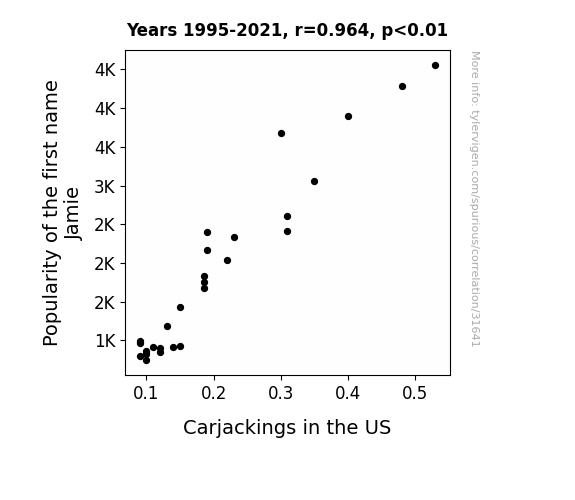 This means 92.8% of the change in the one variable (i.e., Carjackings in the US) is predictable based on the change in the other (i.e., Popularity of the first name Jamie) over the 27 years from 1995 through 2021.