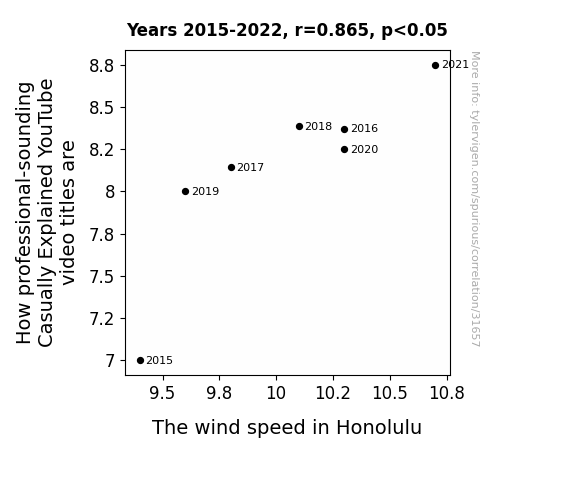 This means 74.9% of the change in the one variable (i.e., The wind speed in Honolulu) is predictable based on the change in the other (i.e., How professional-sounding Casually Explained YouTube video titles are) over the 7 years from 2015 through 2022.