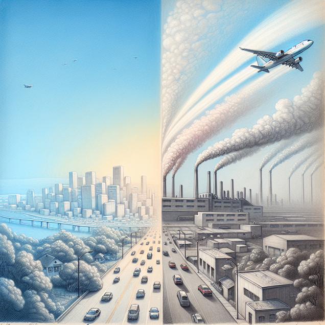 User prompt: Please describe a visual scene that prominently depicts both Air pollution in Vallejo, California and Jet fuel used in Saint Vincent/Grenadines, in the following situation: because as the air in Vallejo got cleaner, it put a hold on the "jet-stream" of pollution, causing fewer jet fuel emissions in Saint Vincent/Grenadines. The "fuel" for the cause? Cleaner air, leading to a "tailwind" of reduced pollution all around!. Keep the description simple.