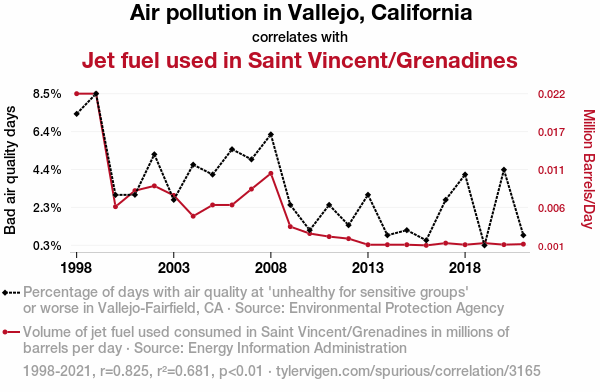 This means 68.1% of the change in the one variable (i.e., Jet fuel used in Saint Vincent/Grenadines) is predictable based on the change in the other (i.e., Air pollution in Vallejo, California) over the 24 years from 1998 through 2021.