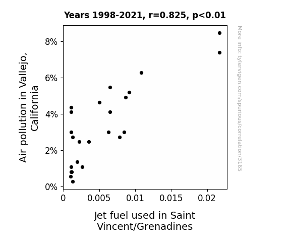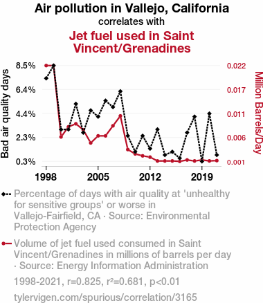 - The spurious research paper: Fumes of a Feather: Exploring the Correlation Between Air Pollution in Vallejo, California, and Jet Fuel Usage in Saint Vincent/Grenadines