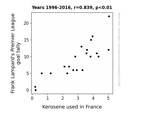 This means 70.4% of the change in the one variable (i.e., Kerosene used in France) is predictable based on the change in the other (i.e., Frank Lampard's Premier League goal tally) over the 21 years from 1996 through 2016.