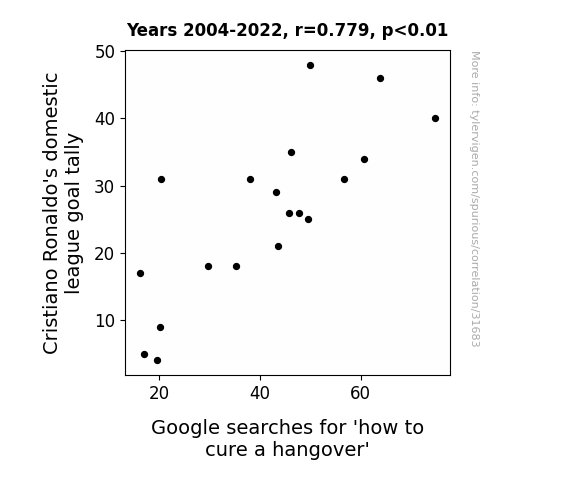 This means 60.8% of the change in the one variable (i.e., Google searches for 'how to cure a hangover') is predictable based on the change in the other (i.e., Cristiano Ronaldo's domestic league goal tally) over the 19 years from 2004 through 2022.