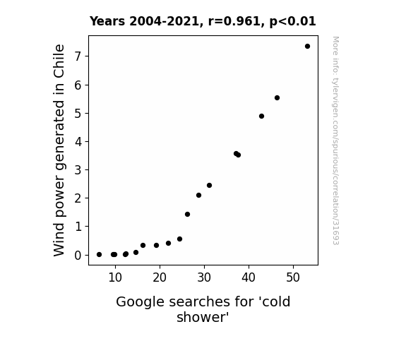 This means 92.4% of the change in the one variable (i.e., Google searches for 'cold shower') is predictable based on the change in the other (i.e., Wind power generated in Chile) over the 18 years from 2004 through 2021.