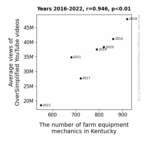 This means 89.5% of the change in the one variable (i.e., The number of farm equipment mechanics in Kentucky) is predictable based on the change in the other (i.e., Average views of OverSimplified YouTube videos) over the 7 years from 2016 through 2022.