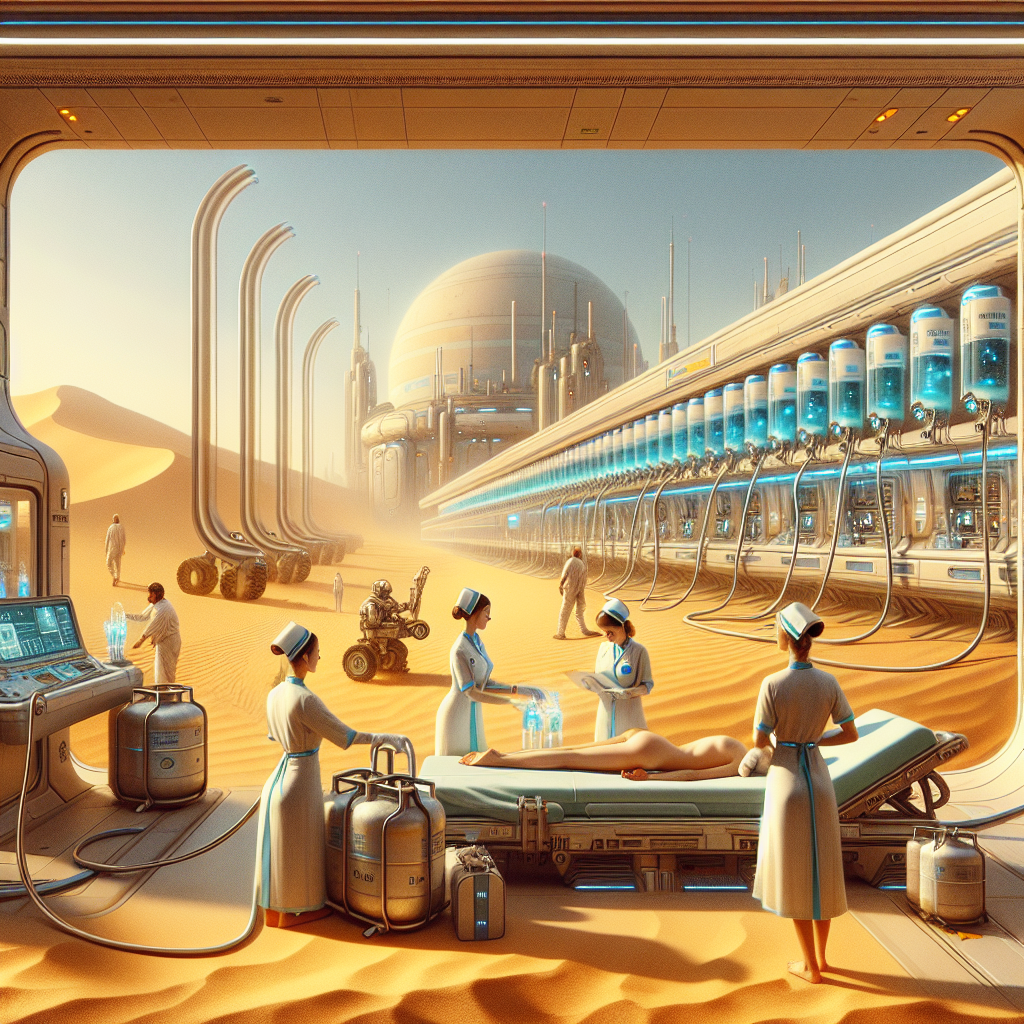 ChatGPT: An image that looks like it is a scene from 'Star Wars': In a bustling hospital in Sudan, nurses with freshly earned Associate's degrees in Nursing are seen tending to patients with ease and confidence. The efficient patient care they provide has visibly reduced stress levels among the healthcare workers. In the background, workers are seen carrying bottles of Liquefied Petroleum Gas (LPG) to fill the relaxing bubble baths that have become increasingly popular among the hospital staff seeking to unwind after a long day. Enhance the visual depiction of this prompt: Create an image that resembles a scene from 'Star Wars' set in a futuristic hospital on a desert planet. The nurses, adorned in advanced medical uniforms, possess an air of empathy and capability as they tend to patients with advanced medical technology. The hospital environment is a harmonious blend of futuristic architecture and desert landscape, with sleek medical equipment seamlessly integrated into the environment. In the background, workers are depicted transporting containers of Liquefied Petroleum Gas (LPG) to fill luxurious, advanced bubble baths, creating an otherworldly atmosphere of relaxation amidst the advanced medical care.