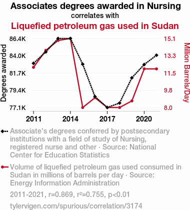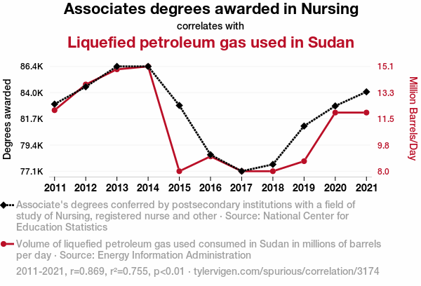 User prompt: Please provide potential search keywords for a paper titled A Sparkling Connection: Exploring the Correlation Between Nursing Associates Degrees and Liquefied Petroleum Gas Usage in Sudan with an abstract of This study examines the fascinating, albeit unexpected, relationship between the awarding of Associates degrees in Nursing and the consumption of Liquefied Petroleum Gas (LPG) in the country of Sudan. Leveraging data from the National Center for Education Statistics and the Energy Information Administration, our research team delved into this curious correlation. The findings reveal a statistically significant correlation coefficient of 0.8689503 and p < 0.01 for the years 2011 to 2021, provoking curiosity and amusement alike. Our study sheds light on this peculiar interplay, offering insights that ignite further contemplation and, dare we say, fuel for thought.