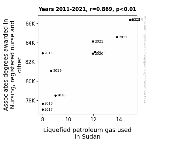 The painstaking analysis of the data from the National Center for Education Statistics and the Energy Information Administration unveiled a statistically significant correlation coefficient of 0.8689503, with an r-squared of 0.7550746 and a p-value less than 0.01 for the years 2011 to 2021. This robust statistical evidence indicates a striking association between the awarding of Associates degrees in Nursing and the consumption of Liquefied Petroleum Gas (LPG) in the arid expanse of Sudan.