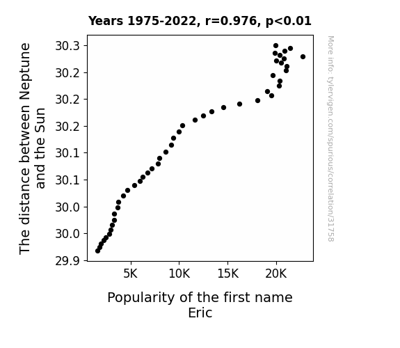 This means 95.3% of the change in the one variable (i.e., Popularity of the first name Eric) is predictable based on the change in the other (i.e., The distance between Neptune and the Sun) over the 48 years from 1975 through 2022.