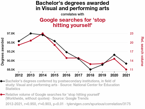 User prompt: Please provide potential search keywords for a paper titled The Curtain Call for Visual Arts' Thrall: A Correlation with Google Searches for 'Stop Hitting Yourself' with an abstract of In this paper, we delve into the enigmatic relationship between the number of Bachelor's degrees awarded in Visual and Performing Arts and the frequency of Google searches for the phrase 'stop hitting yourself'. While seemingly an unusual pairing, our investigation uncovers an unexpected link between artistic pursuits and a peculiar internet query.