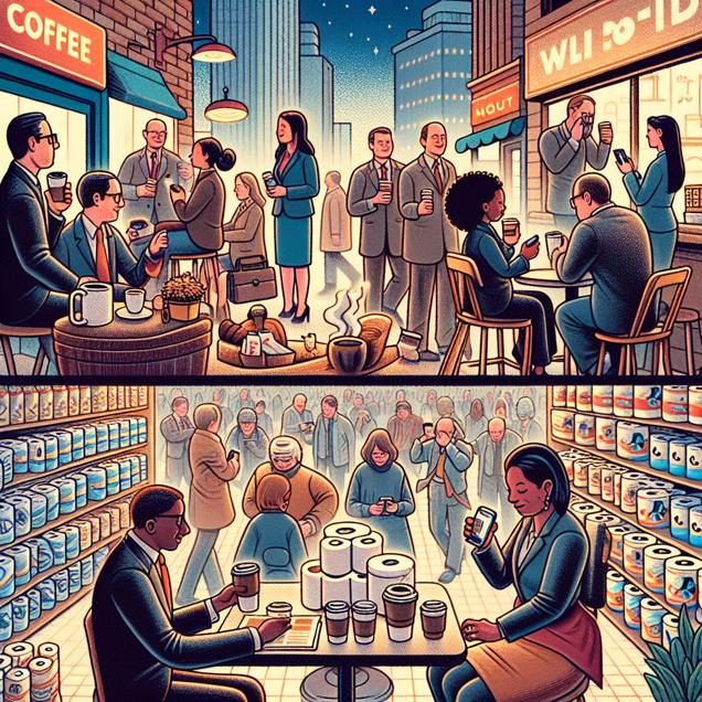 ChatGPT: Generate an image that combines the following scene in a [Cutesy art illustration] style: "In downtown Wilmington, Delaware, a group of private detectives meet at a bustling coffee shop. They are chatting animatedly, surrounded by steaming cups of coffee and stacks of files, discussing the surge in cases they've been handling lately. Meanwhile, at a nearby grocery store, shelves are almost empty as people frantically search for toilet paper, with many simultaneously googling "where to buy toilet paper" on their phones. The scene is filled with a sense of urgency and activity, capturing the contrast between the detectives' calm conversation and the chaotic search for essential supplies."