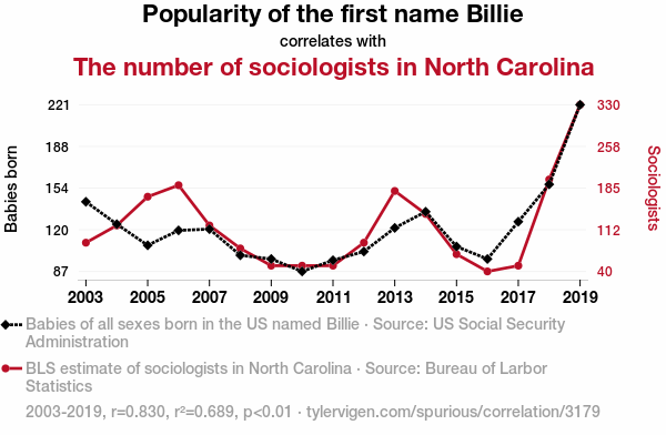 This means 68.9% of the change in the one variable (i.e., The number of sociologists in North Carolina) is predictable based on the change in the other (i.e., Popularity of the first name Billie) over the 17 years from 2003 through 2019.