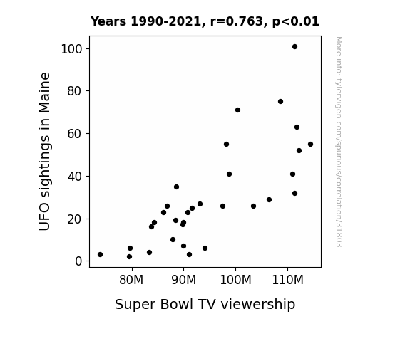 This means 58.2% of the change in the one variable (i.e., Super Bowl TV viewership) is predictable based on the change in the other (i.e., UFO sightings in Maine) over the 32 years from 1990 through 2021.