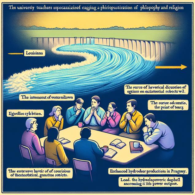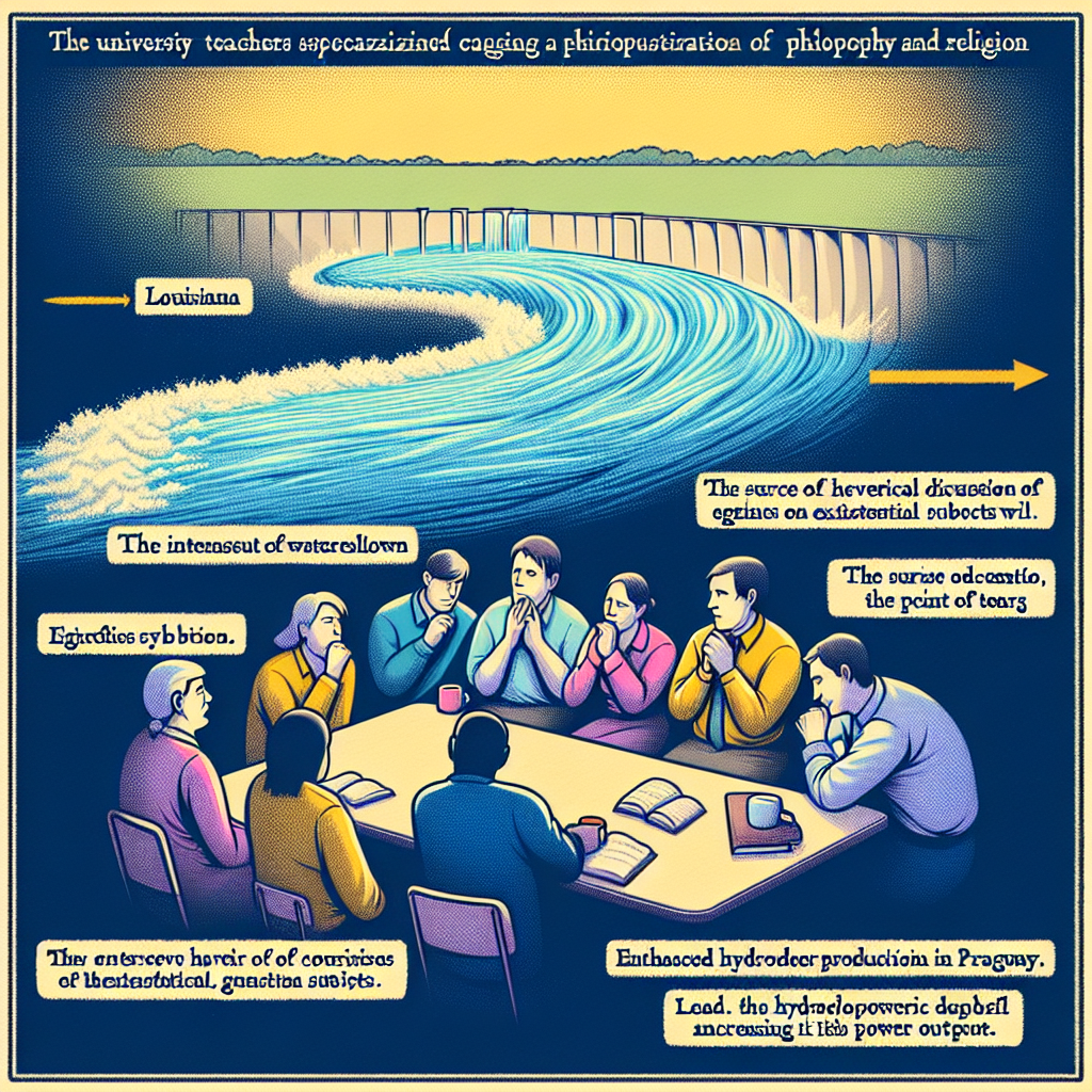 ChatGPT: [Concept art] Prompt: Create a visual scene where a group of university philosophy and religion teachers in Louisiana are engaged in deep discussions about existential questions, leading to emotions welling up and tears. As their discussions intensify, a surge in pondering over the meaning of life causes the Mississippi River to rise. The elevated water levels flow downstream to a hydroelectric dam in Paraguay, where the increased water flow is harnessed to generate additional hydropower energy. The visual should capture the ripple effect of existential pondering in Louisiana translating into increased hydropower energy generation in Paraguay.