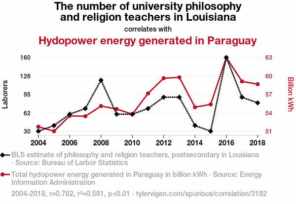 This means 58.1% of the change in the one variable (i.e., Hydopower energy generated in Paraguay) is predictable based on the change in the other (i.e., The number of university philosophy and religion teachers in Louisiana) over the 15 years from 2004 through 2018.