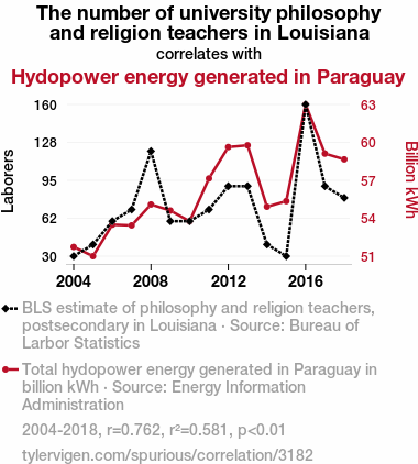 User prompt: Please provide potential search keywords for a paper titled The Philosopher's Stone: Unraveling the Paradoxical Link Between Philosophy and Religion Teachers in Louisiana and Hydropower Energy in Paraguay with an abstract of This study delves into the enigmatic relationship between the number of university philosophy and religion teachers in Louisiana and the hydropower energy generated in Paraguay. Leveraging data from the Bureau of Labor Statistics and Energy Information Administration, our research team explores this puzzling correlation with a statistical rigor typically reserved for less amusing topics.