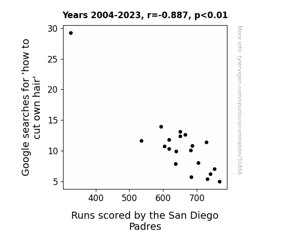 This means 78.7% of the change in the one variable (i.e., Runs scored by the San Diego Padres) is predictable based on the change in the other (i.e., Google searches for 'how to cut own hair') over the 20 years from 2004 through 2023.
