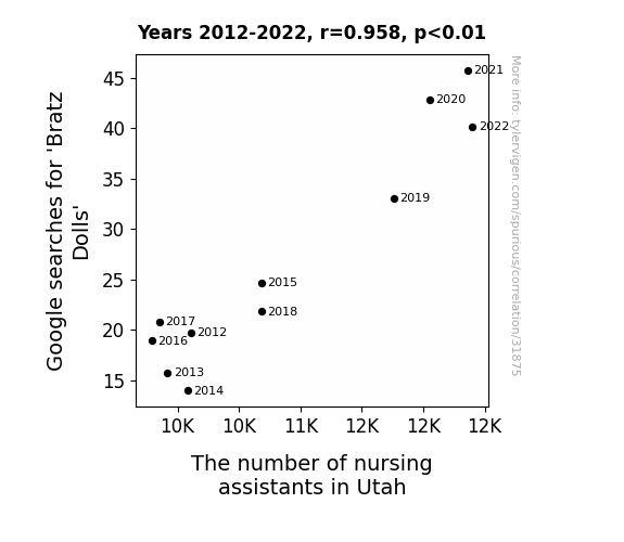 This means 91.8% of the change in the one variable (i.e., The number of nursing assistants in Utah) is predictable based on the change in the other (i.e., Google searches for 'Bratz Dolls') over the 11 years from 2012 through 2022.