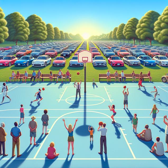Prompt: Generate an image of a vibrant park scene with a basketball court bustling with people playing and cheering. In one corner, capture a row of sleek Miata cars parked under a bright, sunny sky. In the background, include a large sign displaying the decreasing popularity of the name Michael. As the number of Michaels declines, show fewer Miata cars to indicate the decrease in motor vehicle thefts in Massachusetts. The visual should depict a sunny and active park setting with an intriguing nod to the correlation between the name Michael and motor vehicle theft rates. The depiction should include only scenes, people, and objects, it should not include text or speech bubbles.