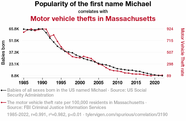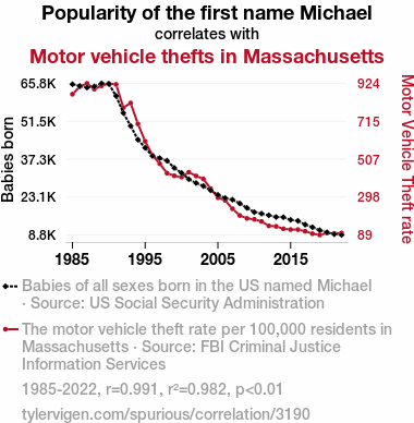 You see, as the name Michael became less popular, there were fewer people around with the urge to blast "Careless Whisper" while cruising in their questionable getaway vehicles. With a declining number of smooth criminals behind the wheel, Massachusetts saw a drop in motor vehicle thefts. It seems that, in this case, the correlation between the name Michael and car heists was more than just a "Faith" - it was a statistical reality.