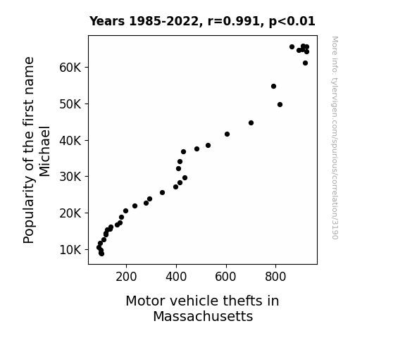 This means 98.2% of the change in the one variable (i.e., Motor vehicle thefts in Massachusetts) is predictable based on the change in the other (i.e., Popularity of the first name Michael) over the 38 years from 1985 through 2022.